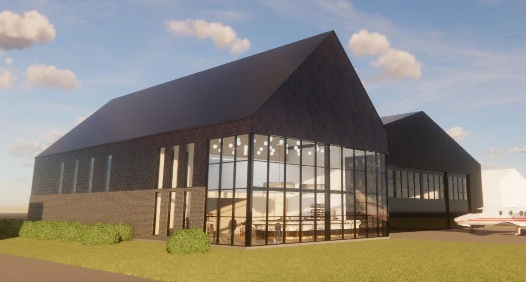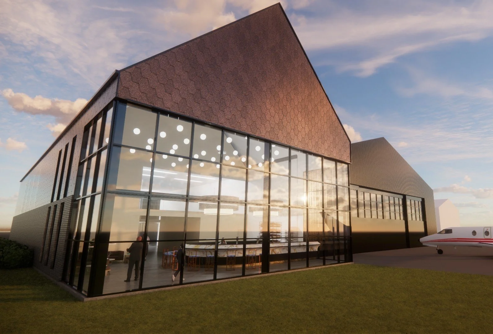 Expansive glazing, premium materials, and a carefully composed architectural form establish a strong visual identity while maximizing natural light and airfield connectivity. The integrated lounge offers a sophisticated setting for client meetings, relaxation, and entertainment—transforming the hangar into a destination rather than a purely utilitarian space.
